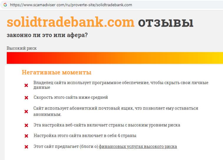 - Отсутствие информации о местонахождении скам-компании SolidTradeBank