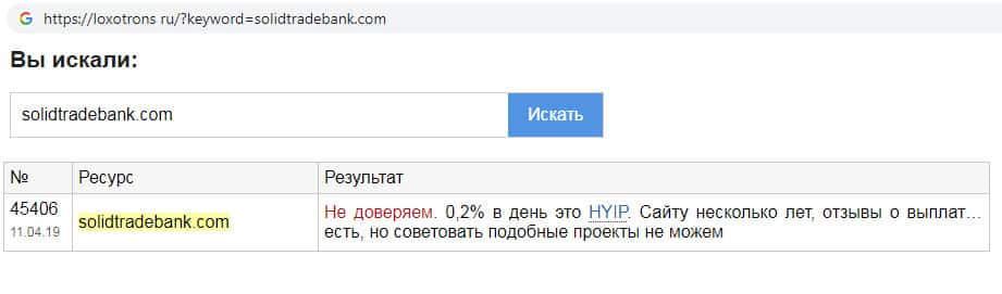 На онлайн-ресурсе loxotrons ru расположена информация об интернет-лохотроне SolidTradeBank, а именно о том, что доверять подобным скам-компаниям нельзя. Вероятнее всего информация о выплатах компании не достоверная и не имеет никакого отношения к действительности. Не связывайтесь с жуликами Солид Трейд Банк !!!