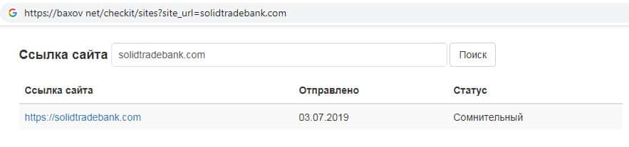 На онлайн-ресурсе baxov net расположена информация об интернет-сервисе скам-компании SolidTradeBank, статус которого определен как сомнительный. Это является поводом для того, чтобы задуматься прежде чем регистрироваться на их дырявом сайте. Мошенники Солид Трейд Банк не возвращают деньги пользователям своего сайта !!!