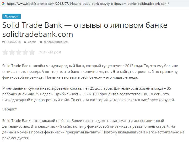 - Пользовательских отзывов о скам-конторе Солид Трейд Банк во всемирной паутине очень мало