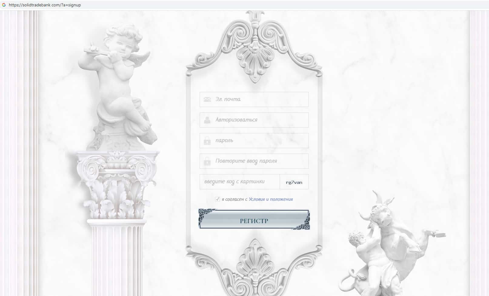 В бланке для регистрации на дырявом сайте скам-проекта Солид Трейд Банк предлагается согласиться с условиями пользования сайтом, но при этом мошенники не предоставляют никакой информации о конфиденциальности персональных данных клиента. Доверять подобным сомнительным конторам вроде SolidTradeBank не рекомендуем !!!