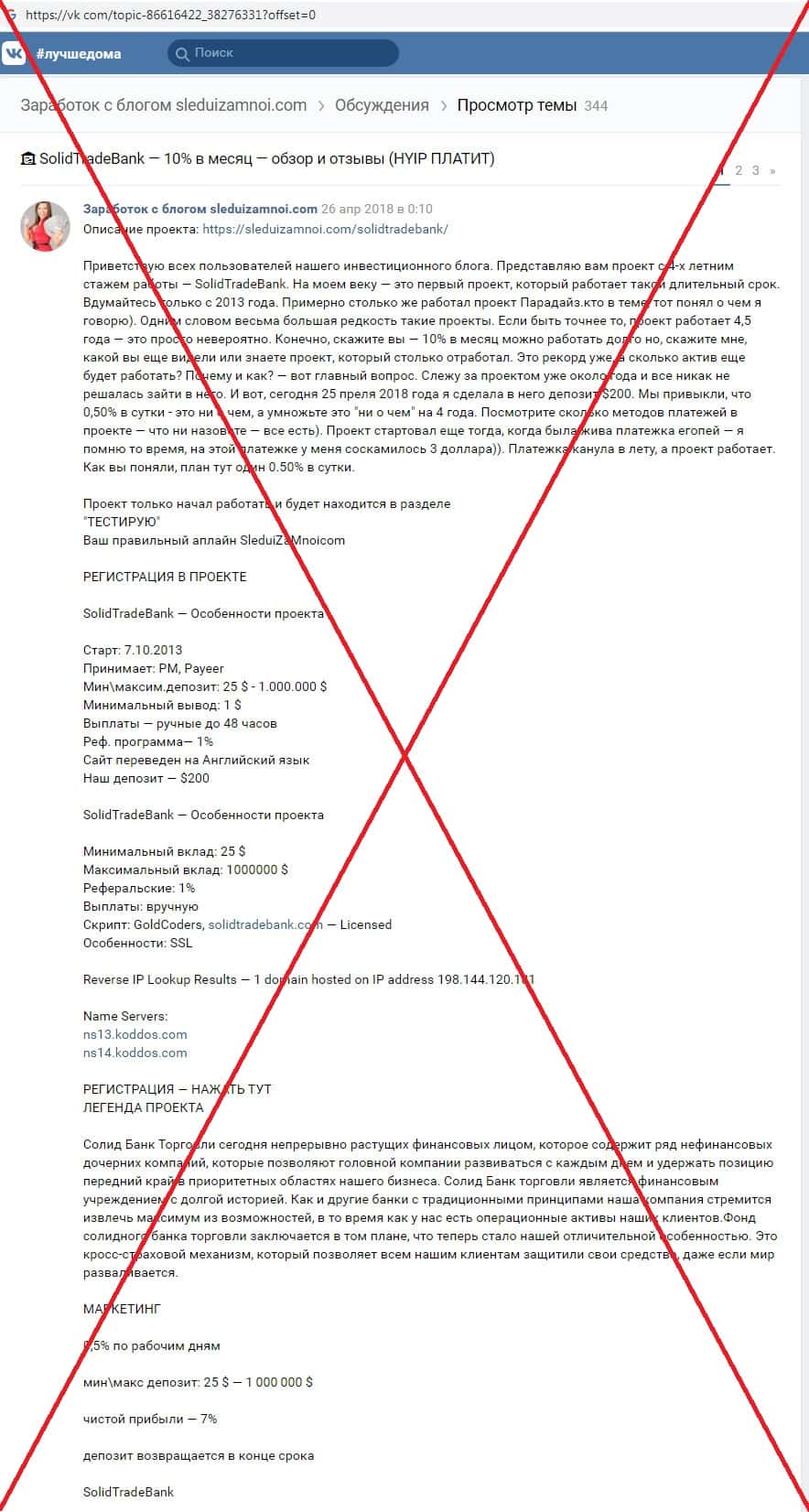 В российской социальной сети vk com отыскана информация о том, что скам-проект Солид Трейд Банк якобы выплачивает обещанную прибыль своим клиентам, что на самом деле далеко не так. Нельзя верить тому, что аферисты SolidTradeBank во всемирной паутине сами о себе пишут !!!