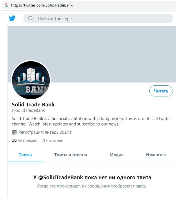 Шулера SolidTradeBank зарегистрировались в социальной сети twitter com, где конечно же есть ссылка на их фальшивый сайт, но какой-либо информации о своей организации мошенники не предоставляют. Это является признаком того, что данная скам-компания не так и востребована как они утверждают.