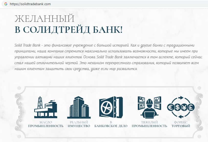 - Интернет-ресурс скам-компании Солид Трейд Банк сомнительный и не вызывает доверия