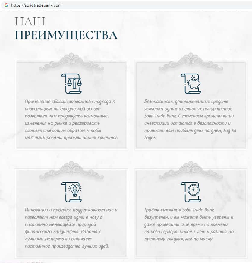 - Что считают преимуществами своей организации аферисты Солид Трейд Банк?