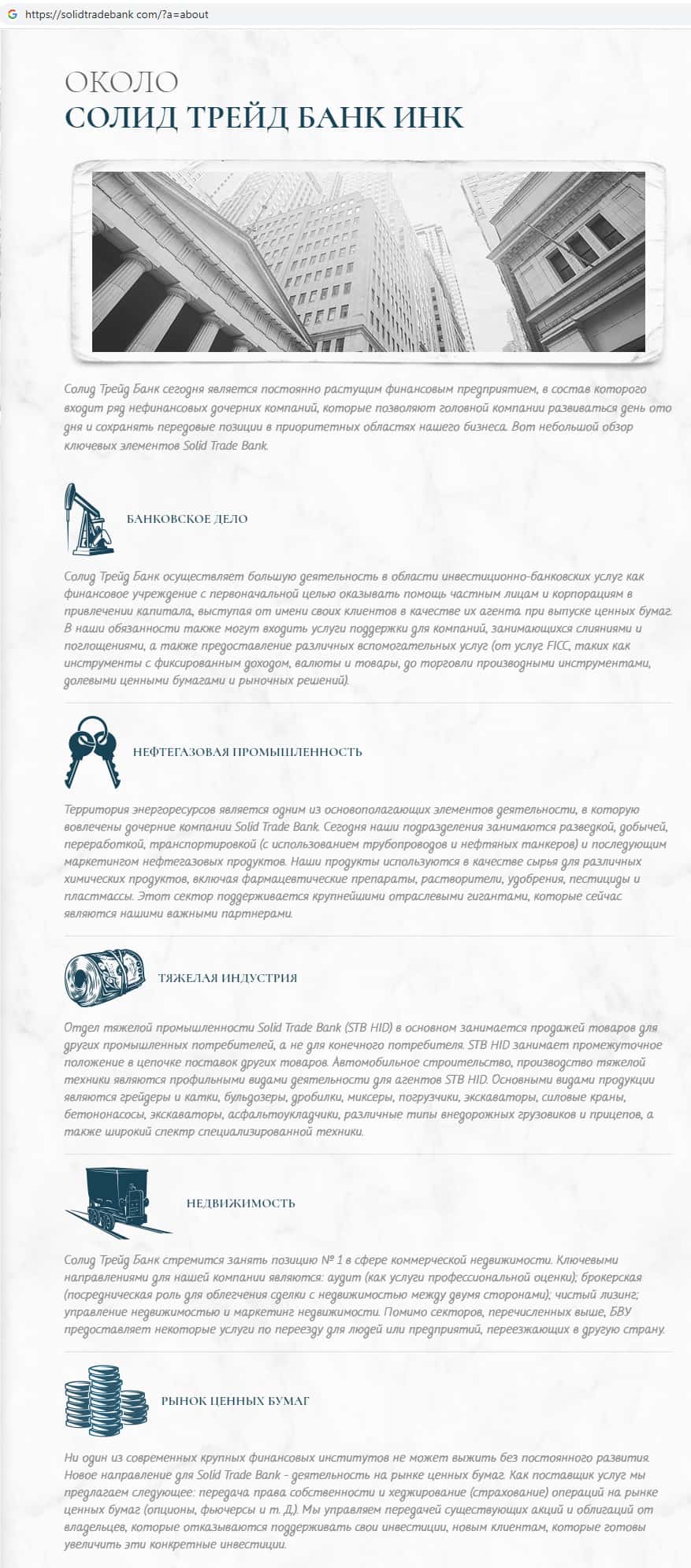 На официальном сайте скам-организации Солид Трейд Банк трудно не заметить информацию о том чем якобы занимается данная контора, а именно: банковское дело, нефтегазовая промышленность, тяжелая индустрия, недвижимость, рынок ценных бумаг, что не имеет никакого отношения к компании SolidTradeBank !!!