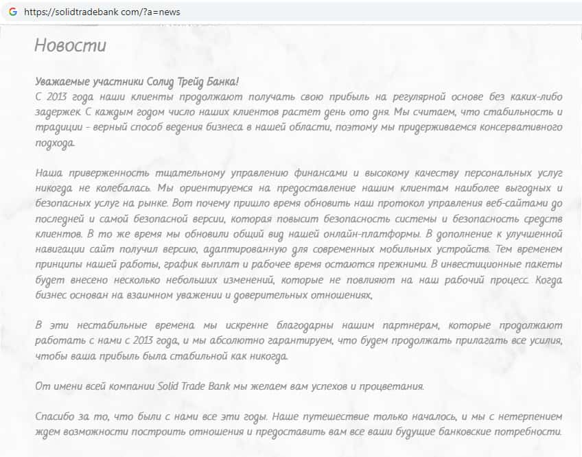 - Скам-проект SolidTradeBank перестал выплачивать денежные средства своим клиентам