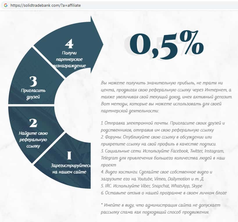 Шулера SolidTradeBank разработали некую рельефную программу, которая существует для привлечения как можно большего количества клиентов в их контору. Мошенники Солид Трейд Банк предлагают за счет этого снизить комиссию за торговлю тому, кто пригласил своего друга в данную организацию.