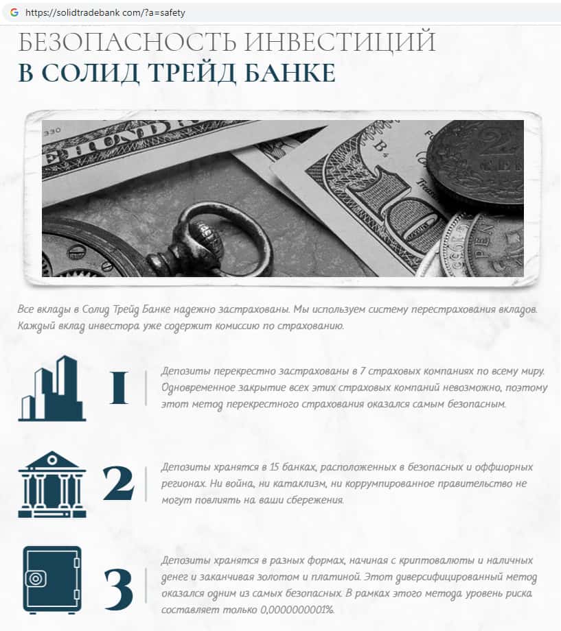 - Жулики SolidTradeBank врут о том, что на их официальном сайте якобы можно застраховать свои денежные средства