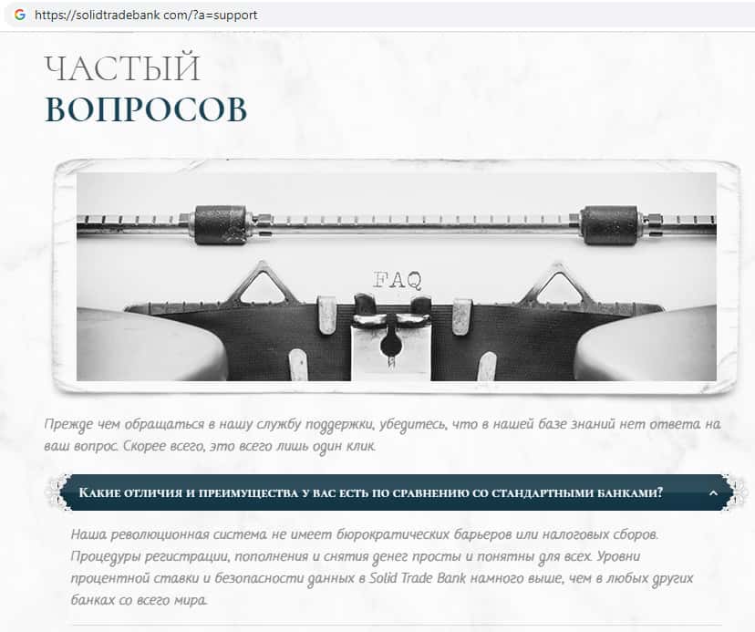 На официальном сайте жуликов SolidTradeBank были замечены уже продуманные всевозможные ответы на те вопросы, которые могут задавать клиенты, например в случае неудачной сделки или же каких либо проблем связанных с работой на сайте.Необходимо обратить свое внимание на то, что данная контора не имеет никакого отношения к банковским системам.