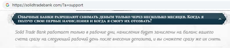 Аферисты SolidTradeBank отвечая на вопрос о том как быстро осуществляется снятие денег со счета пишут о том, что денежные средства со счета можно снять только сразу же после пополнения. Вероятнее всего если подать заявку на вывод позже, то Вам не удастся вернуть ни копейки.