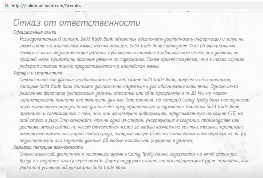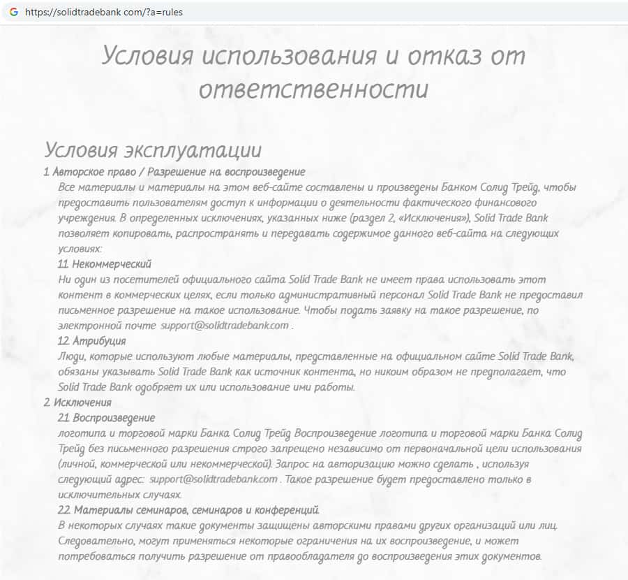 - Условия пользования сайтом мошеннической организации Солид Трейд Банк