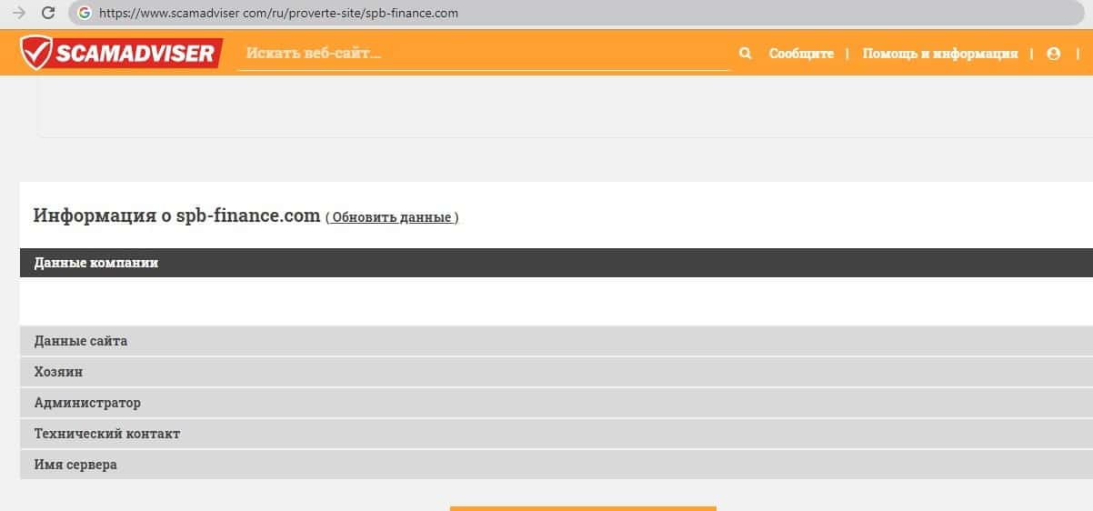 Данные про подвальный сайт СПБ Финанс на портале скамадвайзер