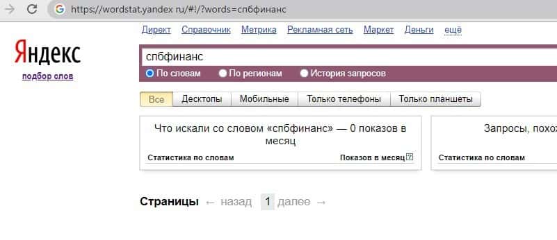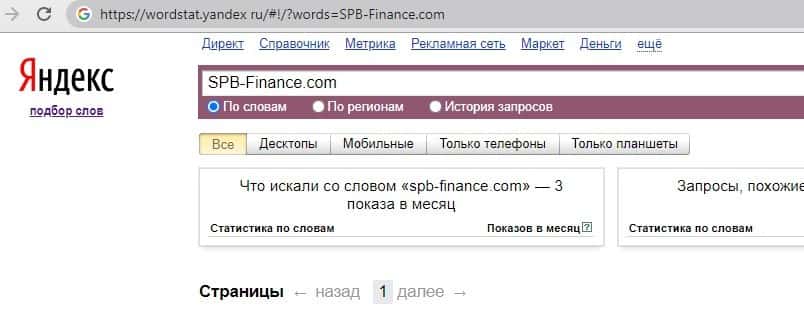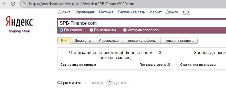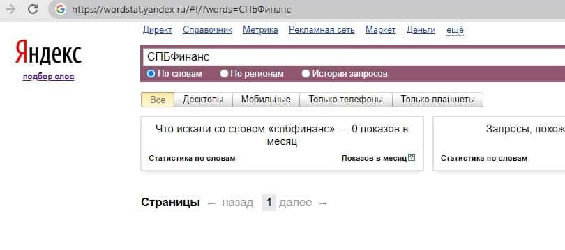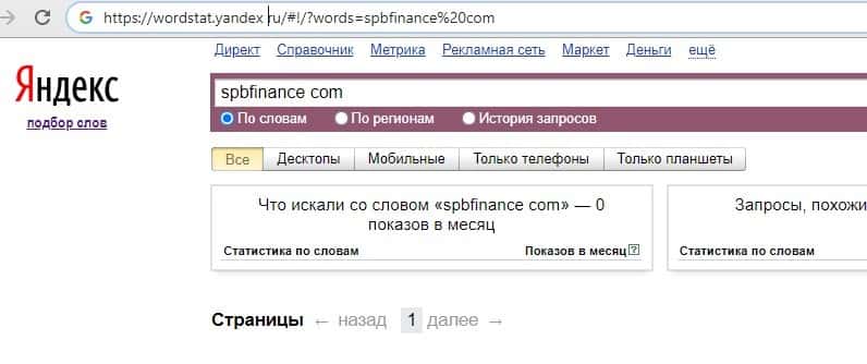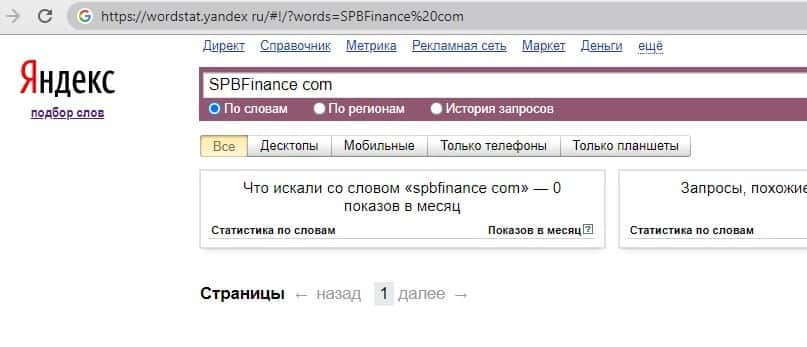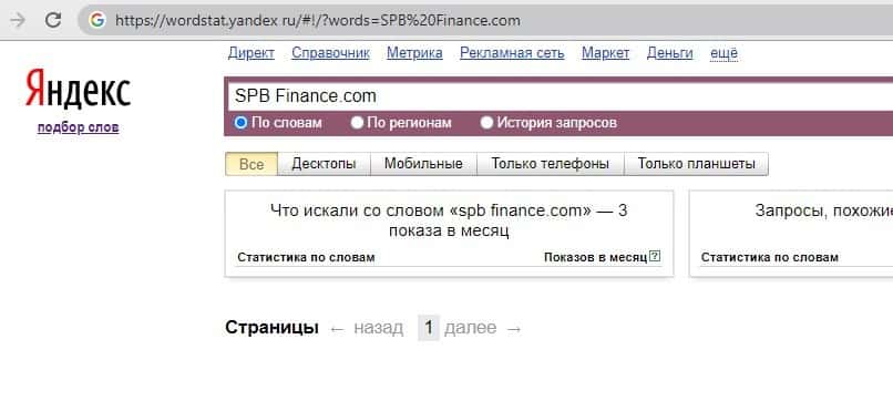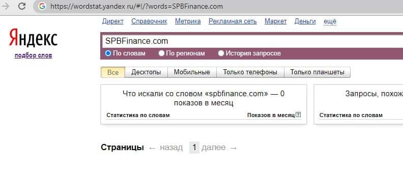 Данные по запросу бренда "SPB Finance com" также не обвенчались успехом и показали нулевой результат среди запросов на поисковом портале yandex ru.
