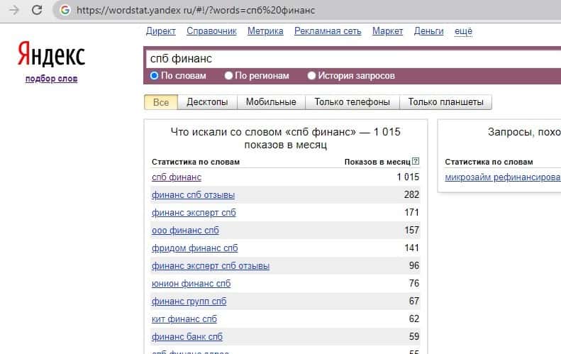 Также запрос бренда "СПБ-Финанс" выдаёт нам результат 1015 человек которые искали данные словосочетания и хотя бы им интересовались, что на самом деле очень мало.