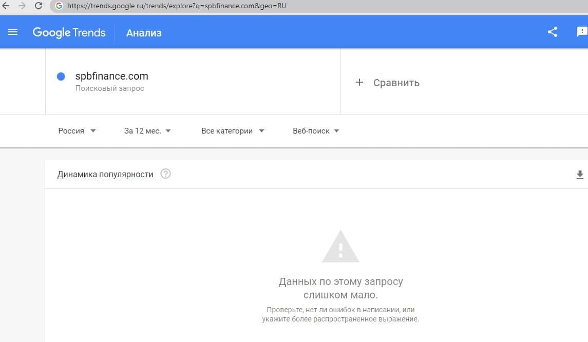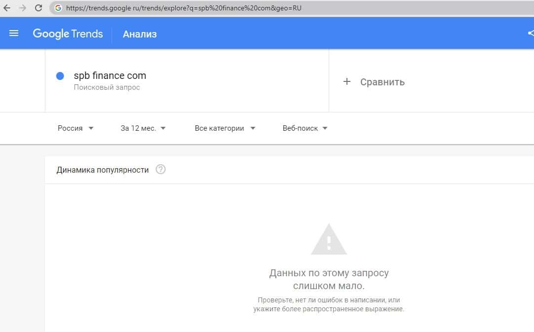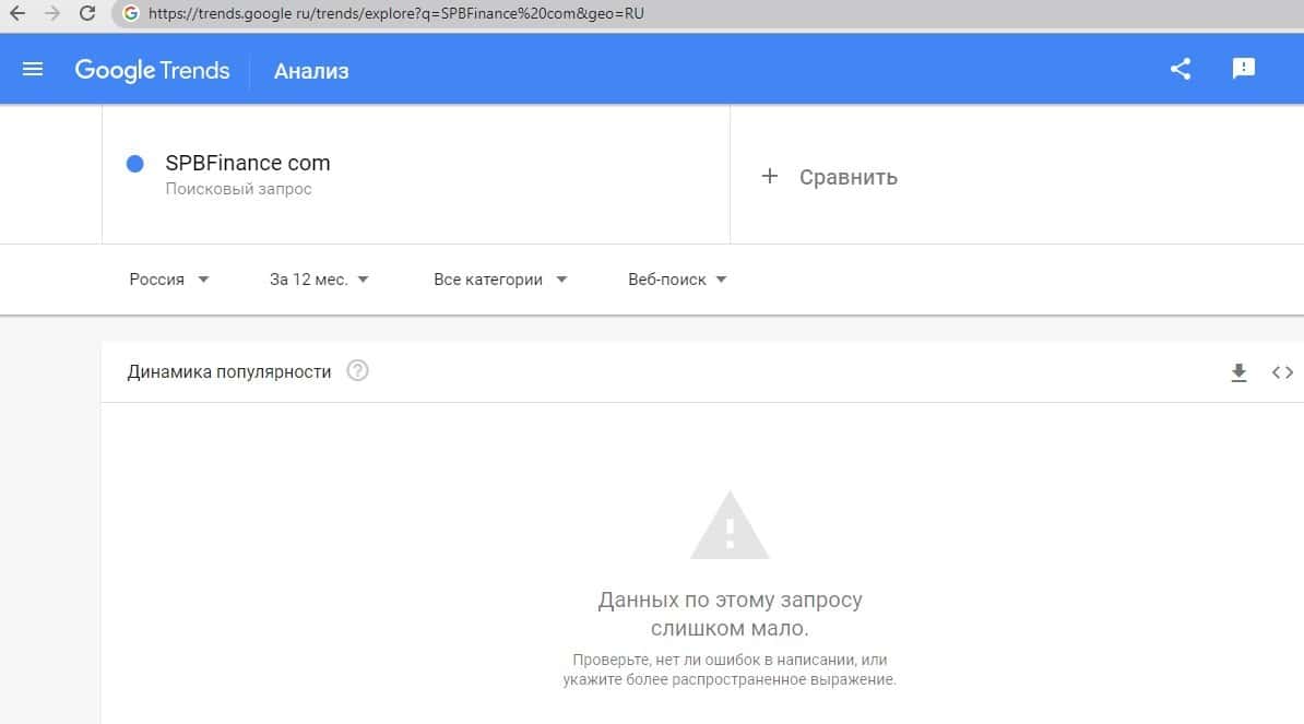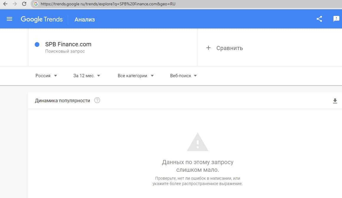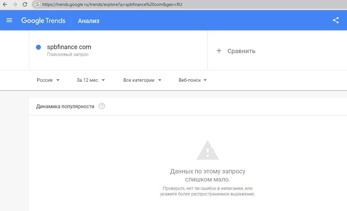 На поисковой площадке google com запрос бренда "spb-finance com" не пользуется популярностью среди пользователей данного ресурса и показывает их недоверие.