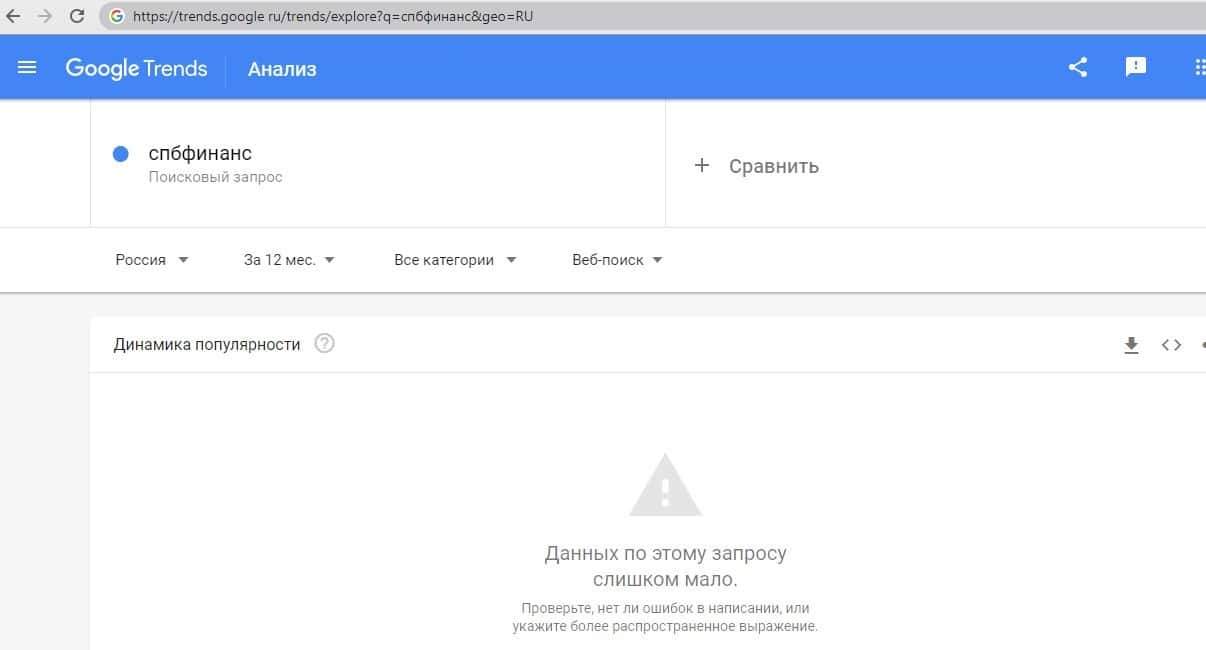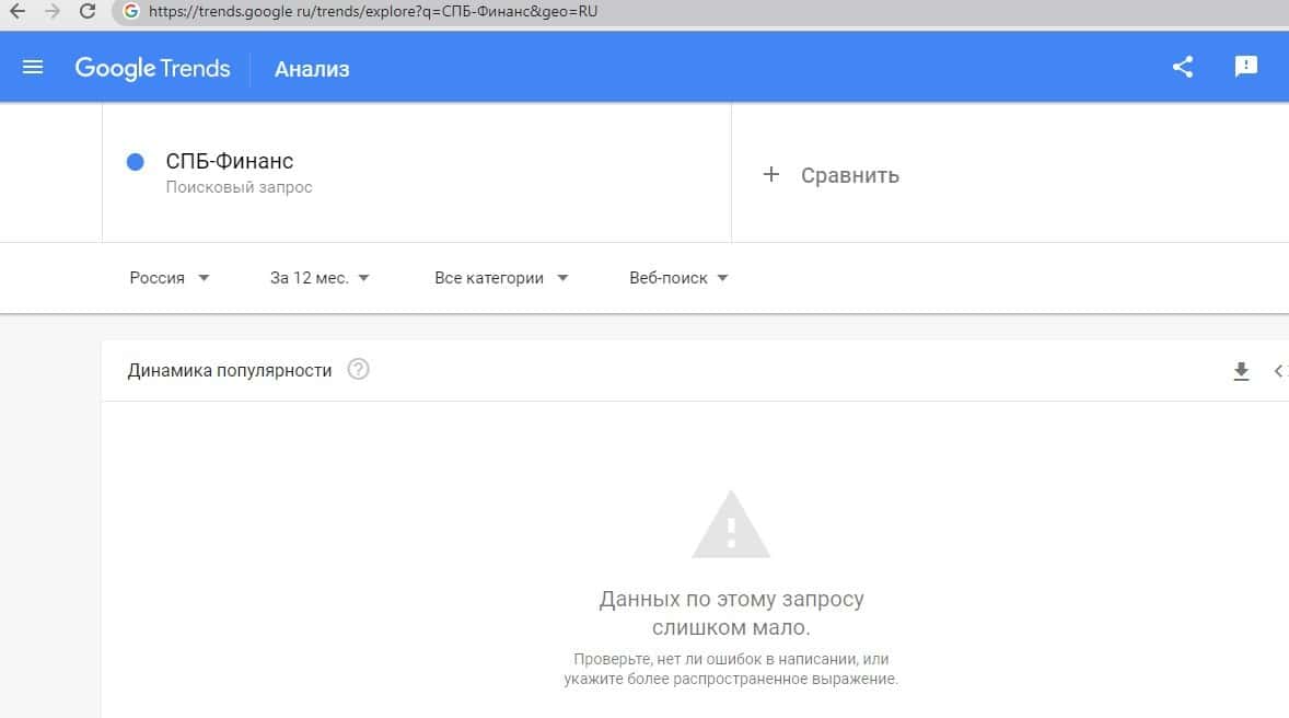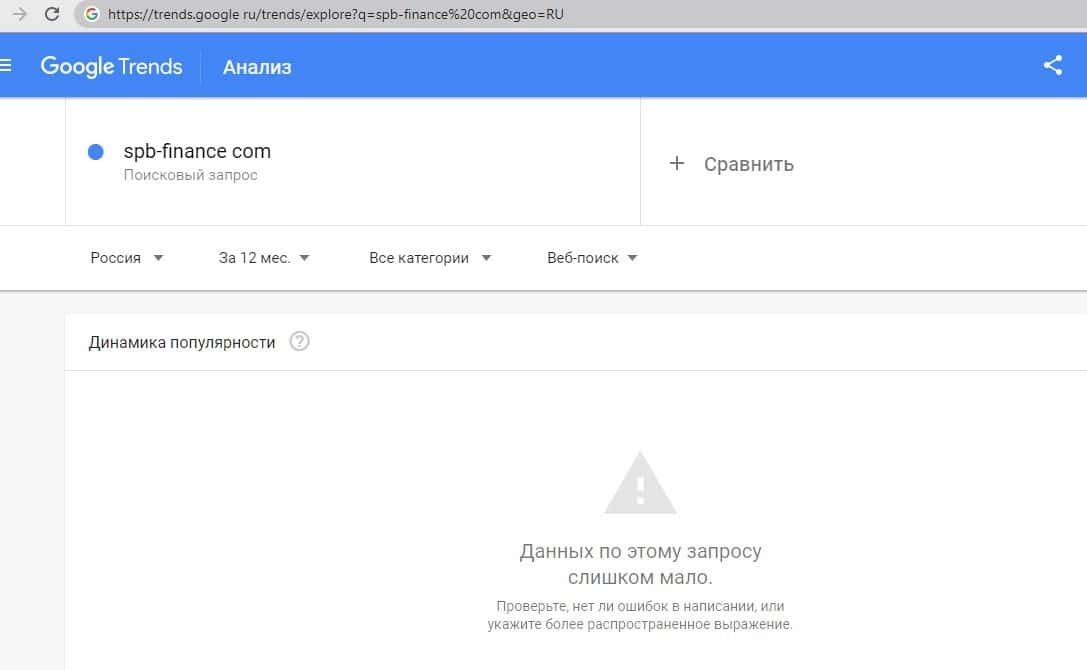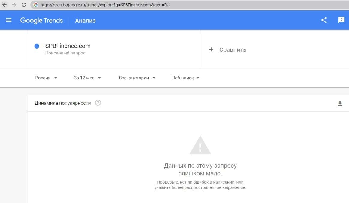 П донным поиска бренда "spb finance com" также видно, что данный запрос не пользуется популярностью у посетителей сети интернет и не привлекает своим названием аудиторию.