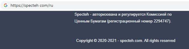 Претендуя на легитимность и пытаясь пустить "пыль в глаза" неискушенному пользователю аферисты из брокерской конторы Спецтех заявляют о своем лицензировании в FCA.