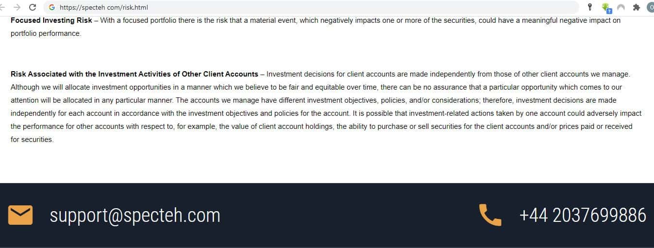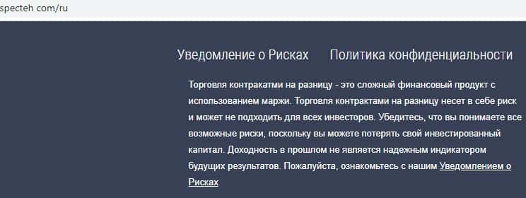 Отдельного раздела, посвященного контактным данным мошенников Спецтех на их портале нет, и лишь на странице с описанием рисков трейдерсккой деятельности можно увидеть телефонный номер брокера:
