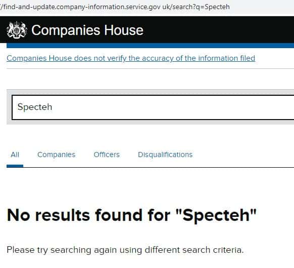 Учитывая упорство аферистов Спецтех на принадлежность своего бизнеса Великобритании (ссылка на FCA, телефонный номер) попробуем найти их бизнес в реестре компаний Англии.