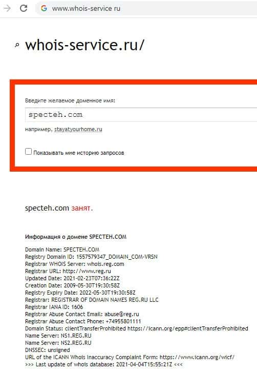 Единственно полезная информация в разделе о регистрации домена specteh com, на основании которой можно сделать вывод, что недавно этот домен сменил владельца.