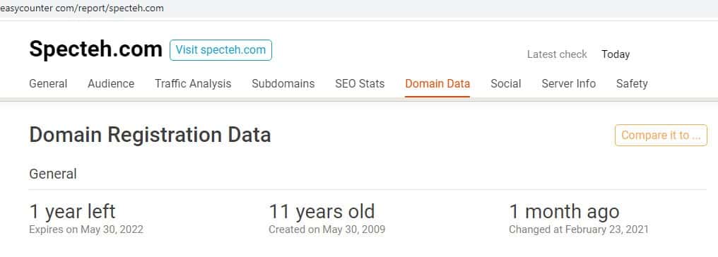 На основе солидного возраста домена specteh com в одиннадцать лет портал scamadviser делает ошибочный вывод о рейтинге доверия в 90% к этому сайту.