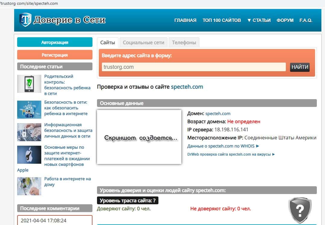 Портал trustorg в полном замешательстве по поводу оценки доверия к ресурсам жульнической конторы Спецтех. Малый трафик и отсутствие реальных отзывов ставят его в тупик.