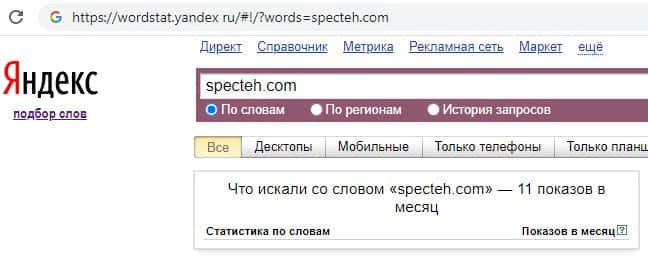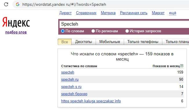 Немного более реальную картину популярности запросов можно отследить по английскому запросу "Specteh", но и то, фактических запросов, касающихся рассматриваемого бренда всего 7 из 159.