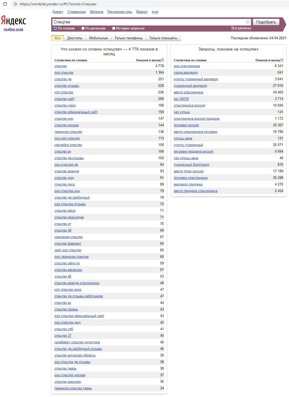- Обзор поисковых запросов информации о брокерской афере Спецтех в поисковой системе Яндекса