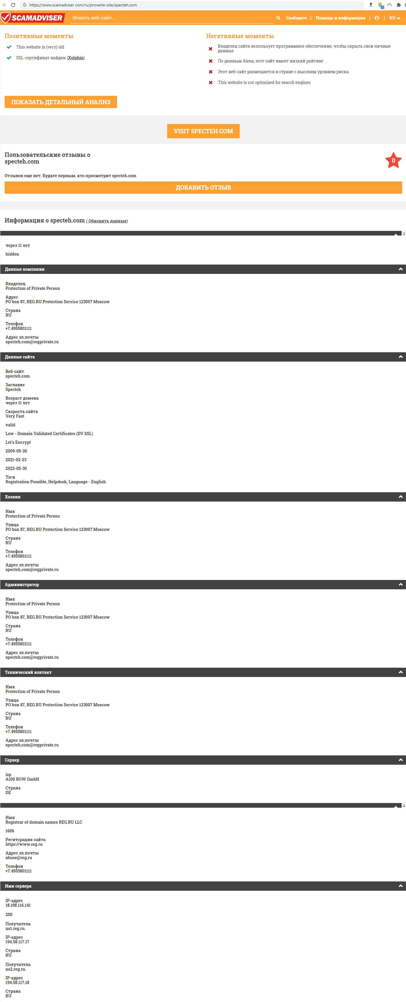 Но при этом правильно указывает на ряд характеристик домена specteh com, присущих лишь мошенническим проектам, как скрытие данных владельцев, низкий рейтинг Alexa, и т.д.