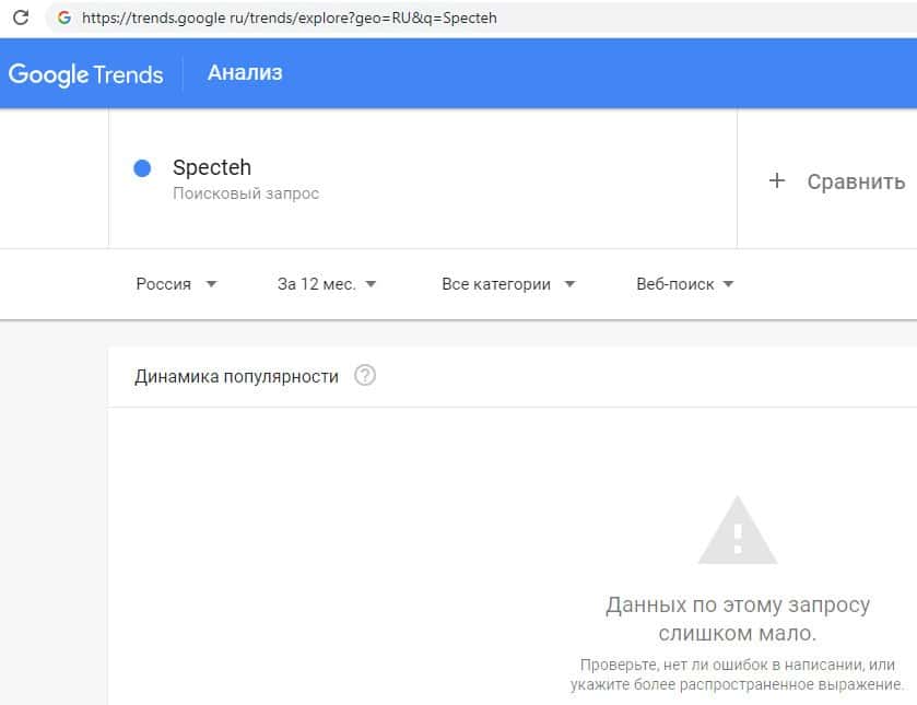 С поисковыми запросами портала брокерской конторы "specteh.com" на поисковике Google та же история - недостаточность данных для анализа популярности данного запроса.