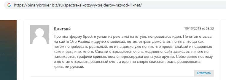 В отзыве о компании махинаторов Spectre Ai пользователь сообщил, что узнал о фирме через рекламу на ютюбе, после чего открыл демо счёт в компании и обнаружил, что у фирмы полно подводных камней. Сайт зависает, графики кривые, после перезагрузки цены совершенно другие. И по этой причине не стал открывать реальный счёт, так как всё плохо реализовано.