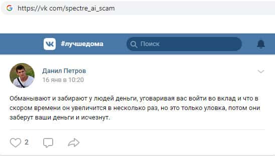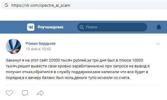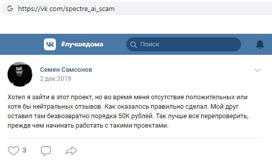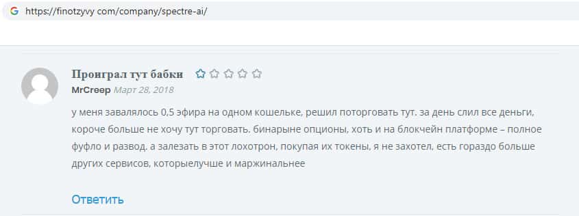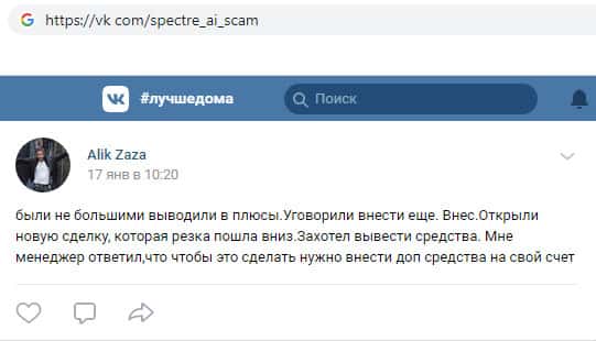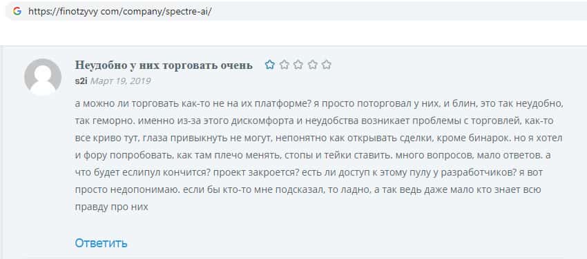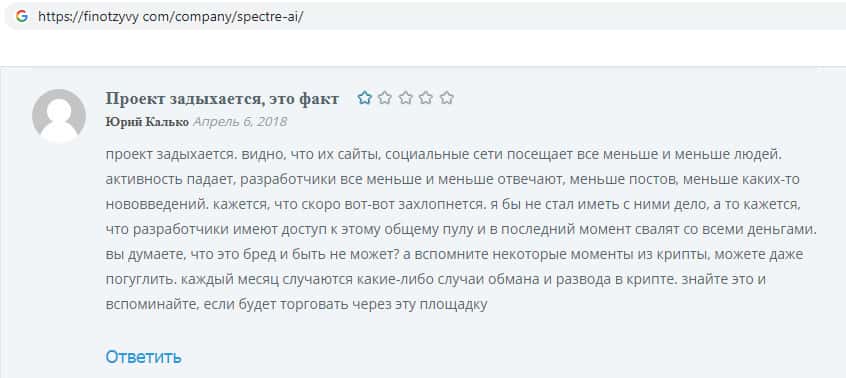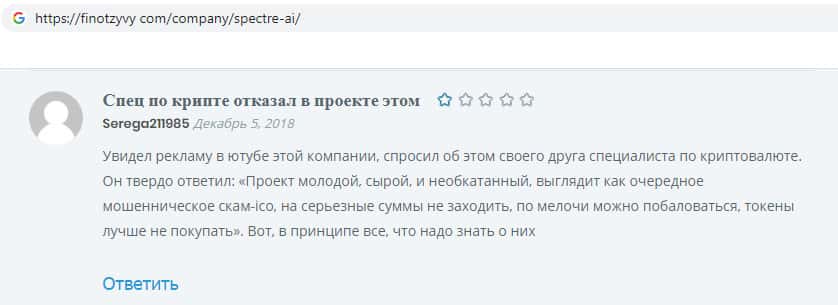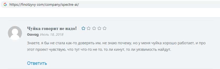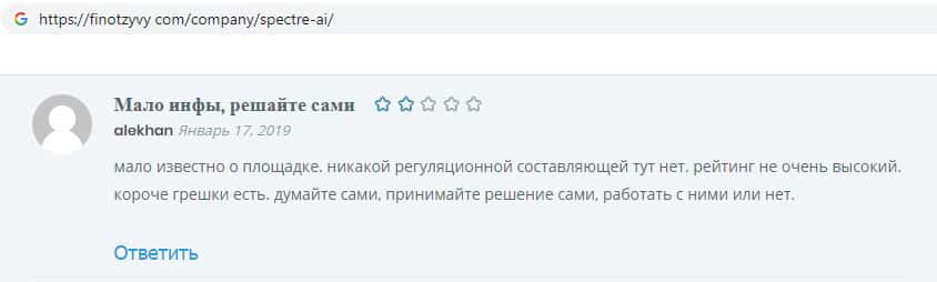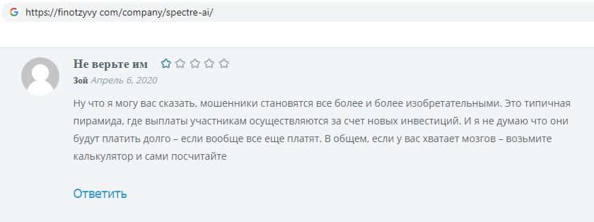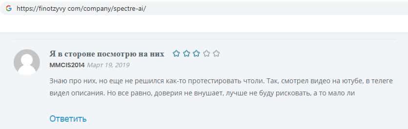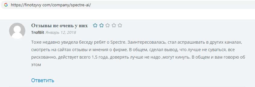 В данном отзыве мы видим, как пользователь увидев рекламу компании Спектре Аи расспросил о неё своего друга, который является специалистом в этой сфере, и он сказал, что компания является сырой, молодой, не обкатанной и выглядит как очередное мошенничество и не стоит вкладывать большие средства в компанию, так как она их присвоит.