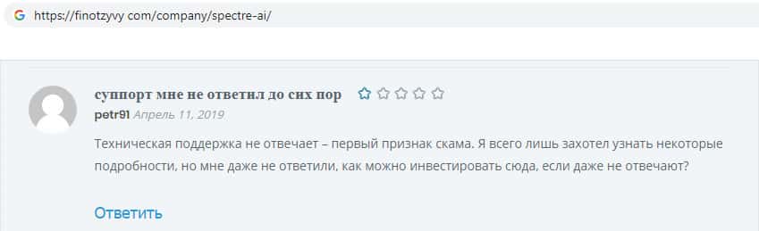 В своём отзыве о компании мошенников Spectre Ai пользователь сообщил, что никто не хочет сотрудничать с данной фирмой, так как никто не заходит на сайт, и по этой причине пользователь так же не стал заходить. Это было правильным решением, ведь сотрудничество с данными жуликами влечёт за собой потерю денежных средств.