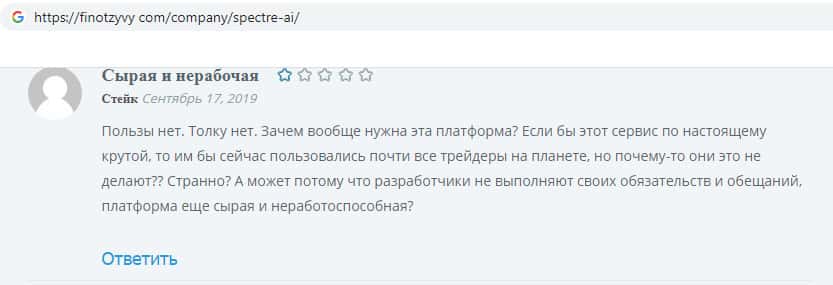 Один из пользователей написал, что платформа компании кидал Spectre Ai является неработоспособной, так как толку с неё нет. Если бы эта компания была так хороша, которой они себя представляют, то все трейдеры уже работали бы там, но они туда не идут. Работать с компанией могут только наивные пользователи, которых легко обмануть.