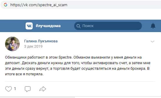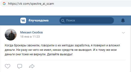 Пользователь в своём отзыве о разводилах Spectre Ai сообщает, что компания настойчиво звонила ему и уговаривала сотрудничать, на что пользователь согласился, но так же он сообщает, что ему не удавалось выводить заработанные средства, а так же его вложенные деньги компания так же отказалась вернуть.