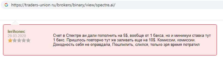 Один из клиентов написал отзыв о фирме Спектре Аи. В нём он сообщил, что пополнил счёт на 5 долларов, хотя можно от 1 доллара, но из за комиссий пришлось ещё пополнять на 10. После чего он начал торговать и слил весь депозит благодаря компании. Так же он говорит о том, что только потратил зря время с данными мошенниками.