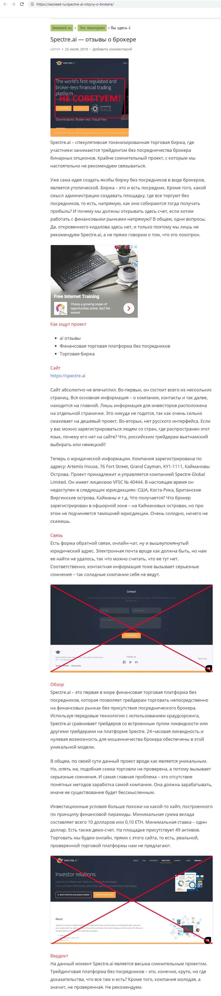 Сайт под названием сеосид ру - опубликовал статью о компании разводил Spectre Ai. Он сообщил, что назвать компанию мошенниками трудно, но она крайне сомнительна, и сайт очень не рекомендует её к использованию. Аферисты очень хитро продумали свой проект, что к нему сложно придраться, но мнение клиентов говорит само за себя.