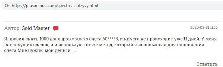 Один из обманутых клиентов компании Спектре Аи рассказал свою историю. Он запросил вывод средств в размере 1000 долларов, но компания игнорирует этот запрос уже более 11 дней. Он сообщает, что открытых сделок у него нет, а так же использует тот же метод вывода средств, что использовал при вводе, значит фирма намеренно его игнорирует.
