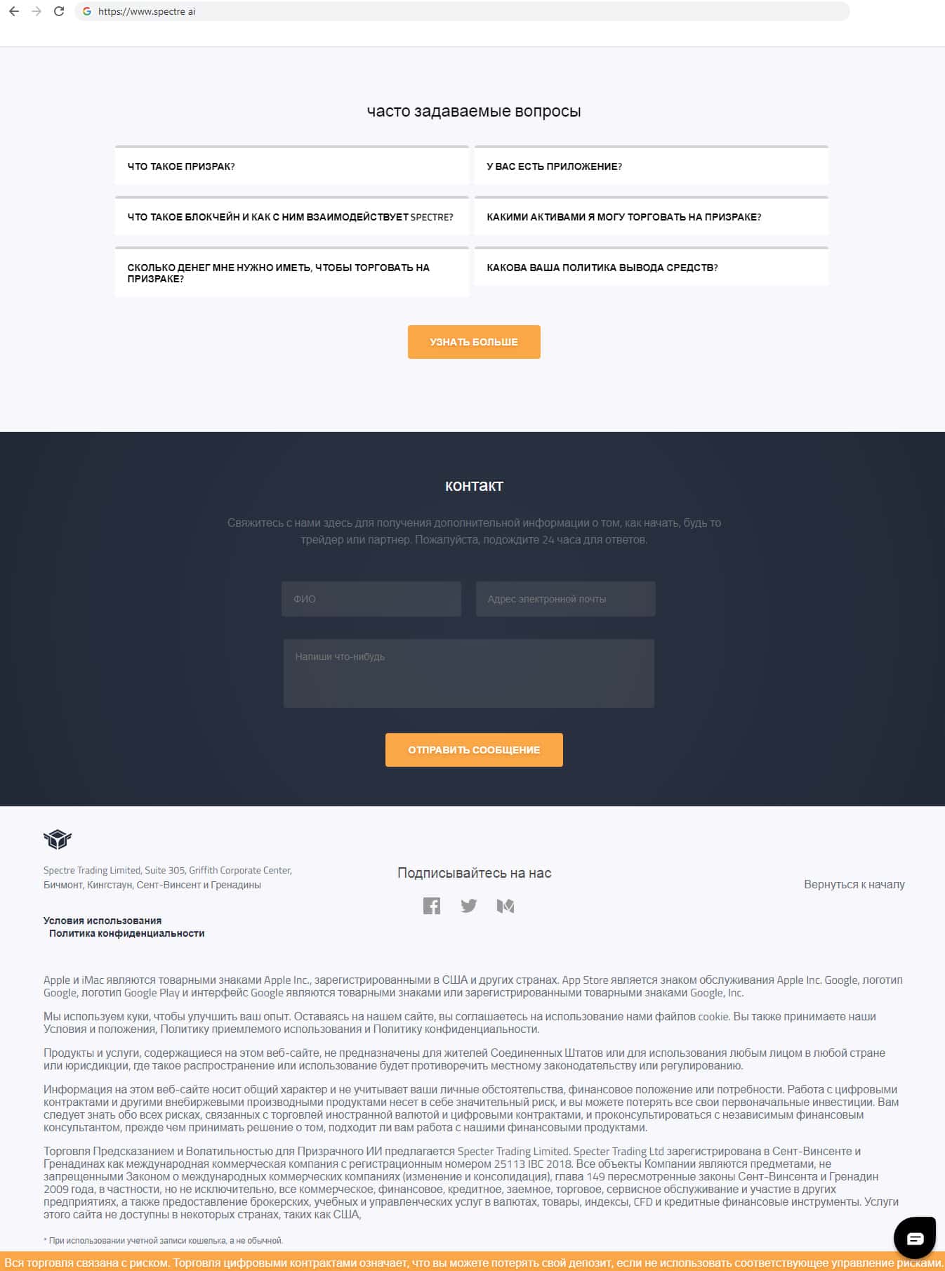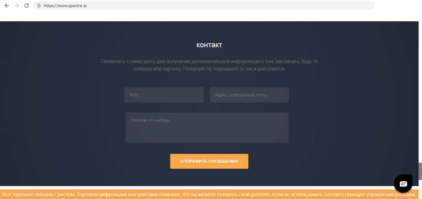 Разводилы Spectre Ai отказались предоставлять свои контактные данные. У такой "огромной" компании почему то нет указанного адреса главного офиса, так же не указан даже номер телефона компании, и адрес электронной почты. Есть только форма связи, которая находится на главной странице сайта. Туда нужно ввести имя. свой адрес почты и вопрос, и только тогда компания ответит.