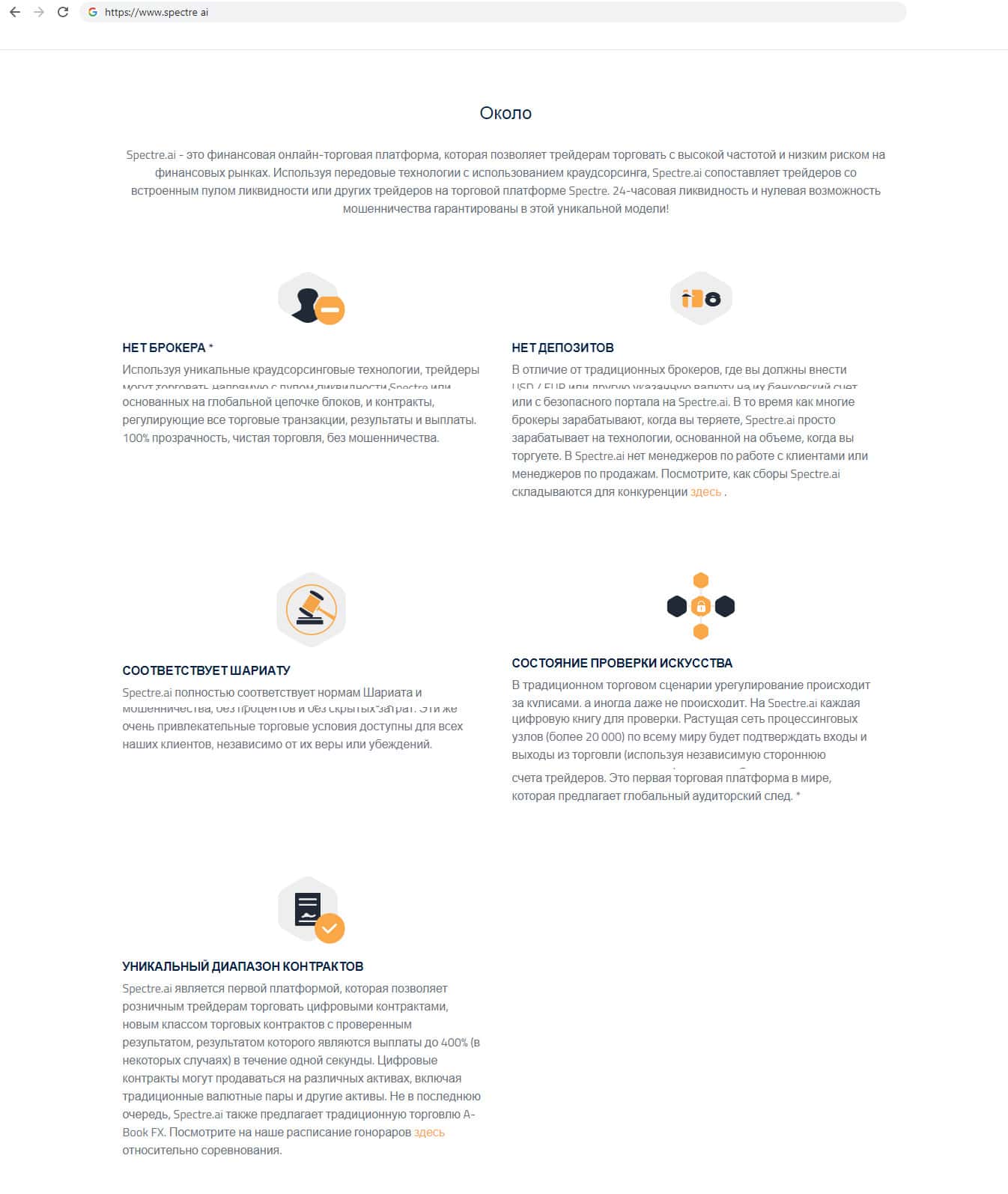 Сразу на сайте мошенники начинают расхваливать свою шарагу. Компания Спектре Аи рассказывает о своих якобы преимуществах перед другими компаниями, но это всего лишь пыль в глаза пользователям, так как у компании нет абсолютно ничего, чем бы она смогла заинтересовать пользователей, кроме вранья и лапши на уши клиентам.