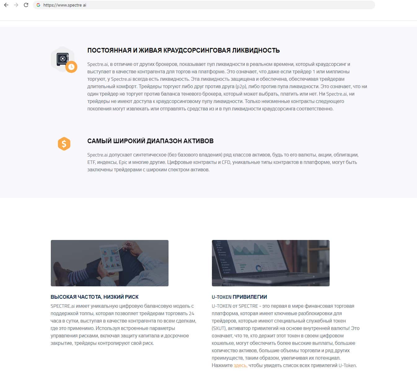 Далее компания продолжает вешать лапшу на уши пользователям, рассказывая им, что у компании Спектре Аи широкий диапазон активов, хотя это не так, так же врёт о том, что у фирмы очень маленькие риски потери денежных средств. И жулики не забыли рассказать о своём токене, который очень сомнителен и никем не рекомендуется.