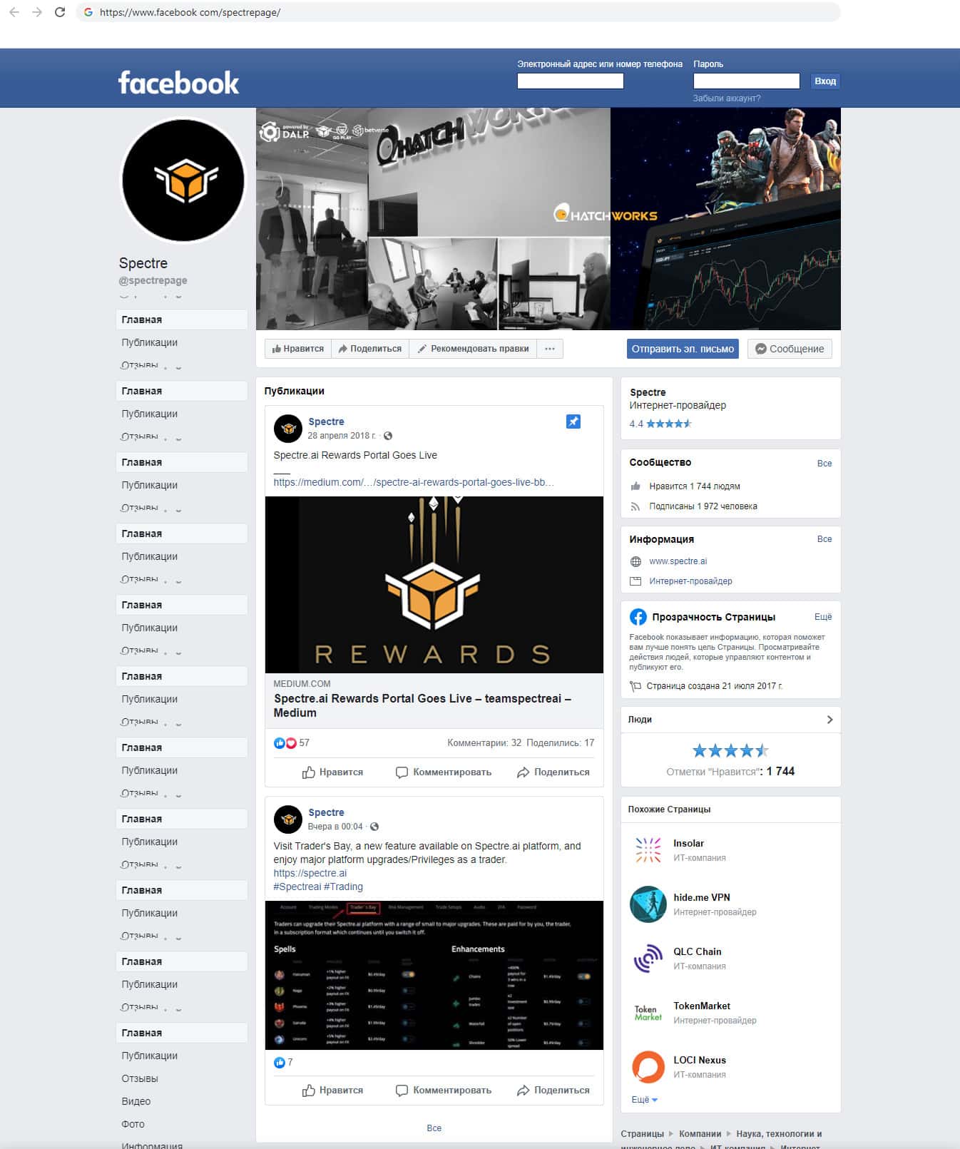 Нам удалось обнаружить страницу кидал Spectre Ai на самой известной социальной сети в мире - фейсбуке. Там компания обзавелась не малым количеством подписчиков, которым втирает фальшивую информацию о своей конторе. На сегодняшний день у компании 1972 подписчика, что является довольно большой аудиторией.