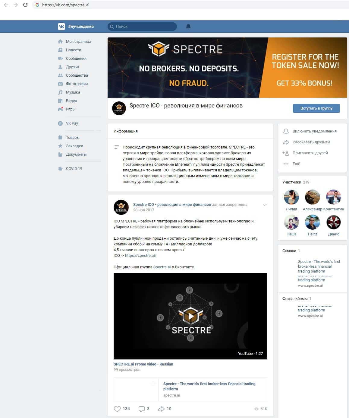 Так же нам удалось найти аккаунт лохотронщиков Spectre Ai на не менее популярной социальной сети Вконтакте. Но там жуликам не удалось завоевать большую аудиторию. Количество подписчиков составляет всего 219 человек. Но учитывая, что каждый из них может попасть в ловушку компании и инвестировать, то фирма сможет украсть большую сумму денег.
