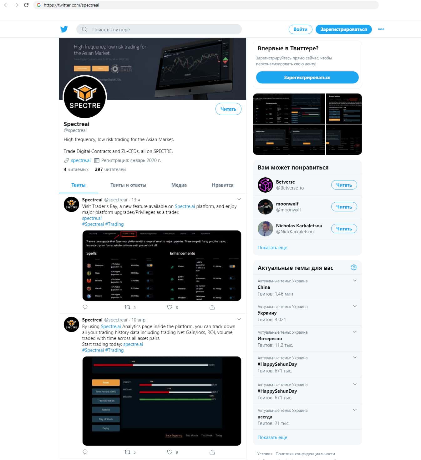 На твитере так же существует страница, которая принадлежит аферистам Spectre Ai. Как и Вконтакте страница не обрела ожидаемого успеха. Всего 297 подписчиков. Но фирма всячески старается заманивать пользователей к себе, ведь от этого зависит их заработок. Чем больше людей обманут, тем больше денег смогут украсть.