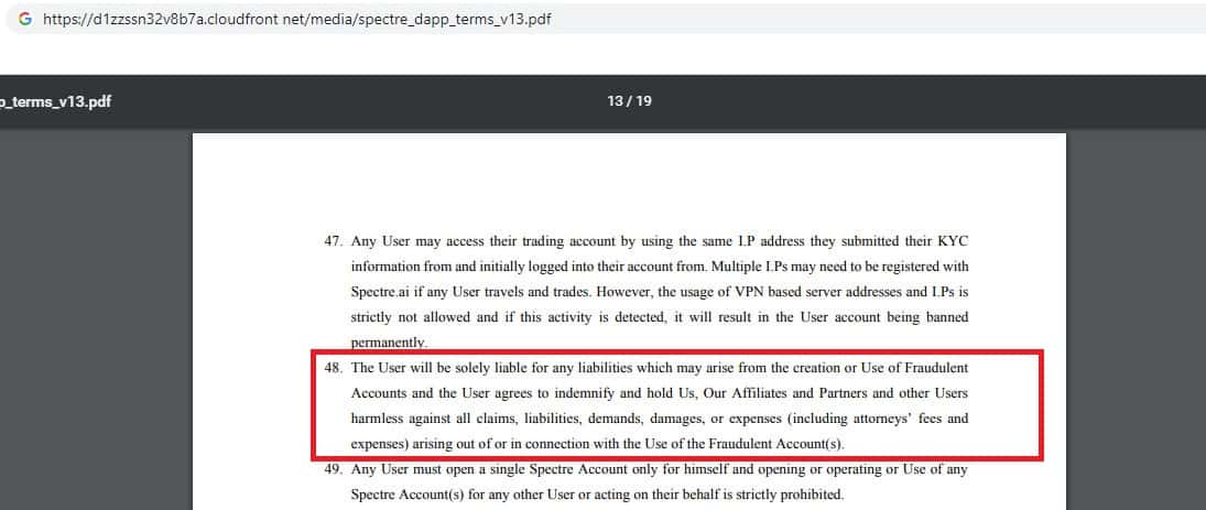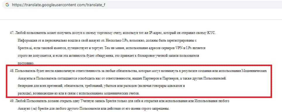 В одном из пунктов договора с мошенниками Spectre Ai указывается то, что пользователь берёт на себя ответственность за возможное мошенничество, и снимает эту ответственность не только с компании но и её партнёров. То есть если жулики или их партнёры будут увлечены в мошенничестве, то ответственность за это полностью лежит на клиенте компании.