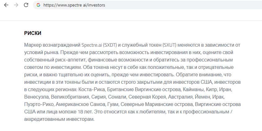 Кидалы Спектре Аи так же предоставили информацию о рисках, связанными с инвестированием в токены компании. Судя по отзывам компания заставляет их покупать и не думать, а тут даже предоставили информацию о рисках, в которой снимают с себя ответственность о потере средств из за покупки их продукта.
