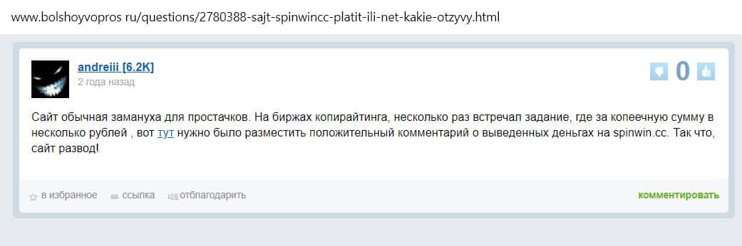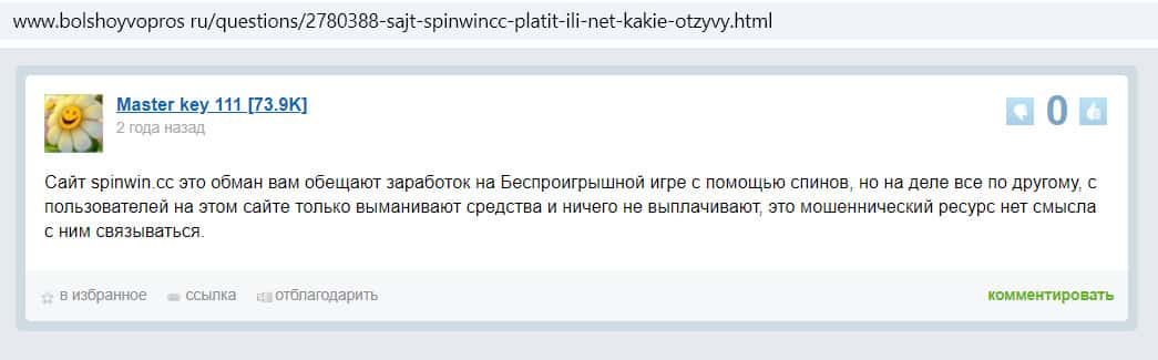 На сайте Большойвопрос пользователь написал, что Спин Вин заманивает беспроигрышной игрой, но на деле только выманивают средства и ничего не выплачивают.
