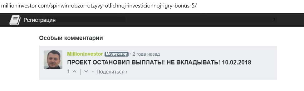 На сайте Миллионинвестор модератор оставил сообщение, что казино Спин Вин прекратило выплаты игрокам. Он предупреждает, что вкладывать деньги туда не надо.