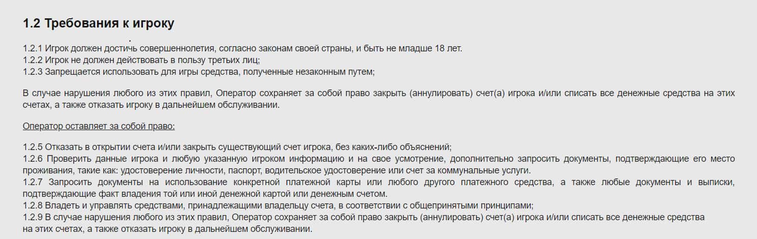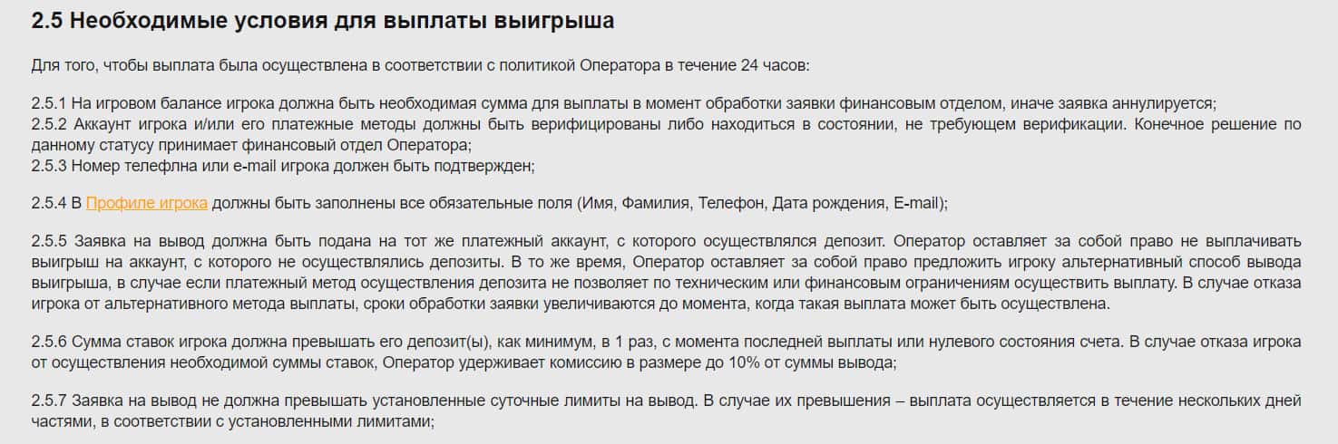 Пункт 2.5 рассказывает об условиях выплаты выигрышей. Администрация сайта оставляет за собой право не выплачивать выигрыш на аккаунт, с которого не осуществлялись депозиты.